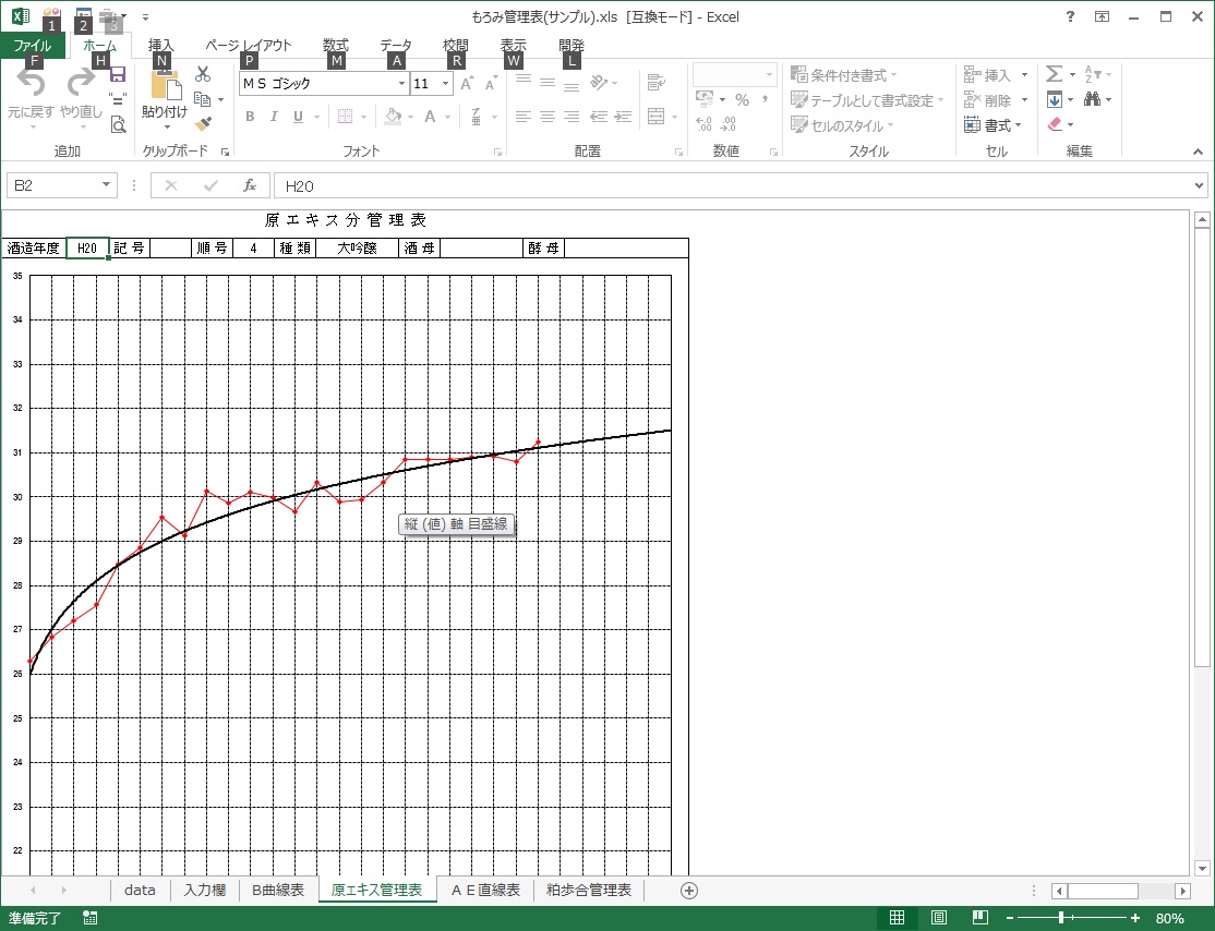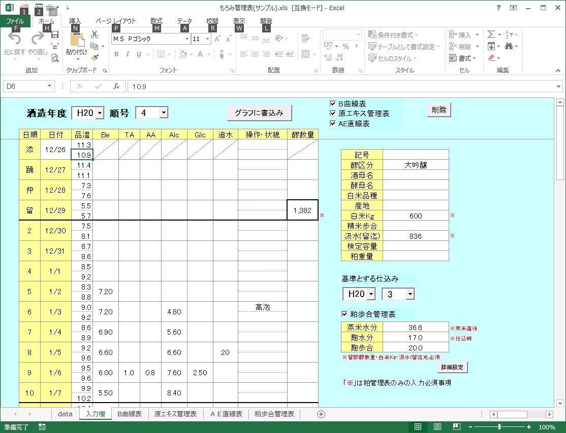 もろみ経過簿をパソコンで管理するためのソフト。B曲線表・原エキス管理表・AE直線表を作成